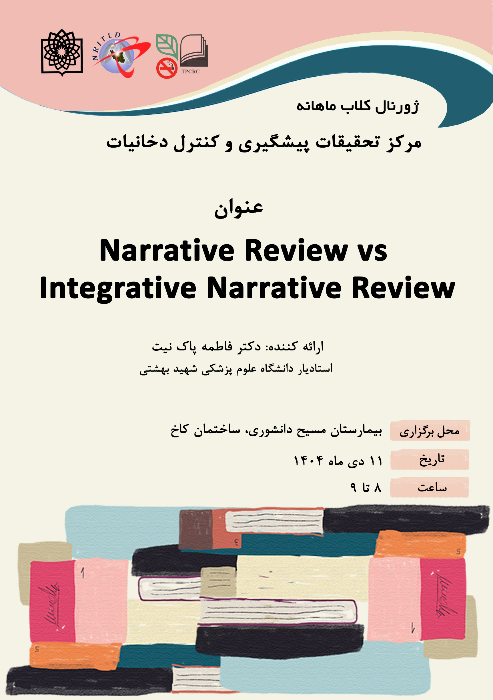 مرکز تحقیقات پیشگیری و کنترل دخانیات قصد دارد از این به بعد به صورت ماهانه برنامه ژورنال کلاب برگزار کند. اولین ژورنال کلاب این مرکز مورخ ۱۱ دی ۱۴۰۴ از ساعت ۸ تا ۹ در بیمارستان مسیح دانشوری برگزار می شود. عنوان آن Narrative Review vs. Integrative Narrative Review است که توسط خانم دکتر فاطمه پاک نیت ارائه می شود.