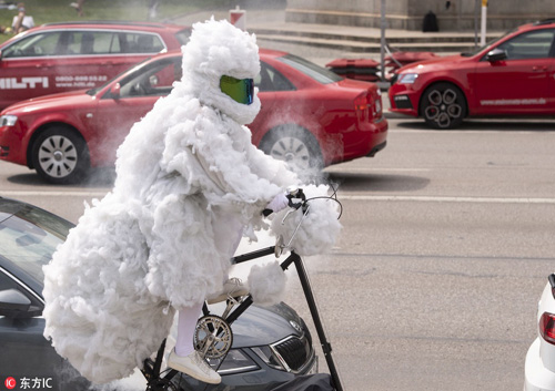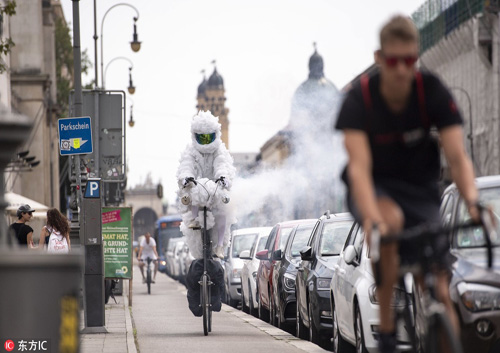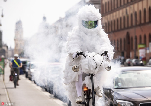 مارتین نوت‌هلفر، طراح و هنرمند آلمانی با لباسی از حباب های صابونی در اعتراض به کشیدن سیگار در پارک گاردن انگلیش شهر مونیخ دوچرخه‌سواری کرد.