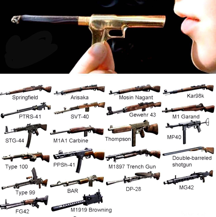 تصاویرپایین تمام سلاحهای قابل حمل جنگ جهانی دوم هستند که باعث مرگ میلیونها نفر شدند. وتصویر بالا سلاح گرمی به نام سیگار است که طبق تحقیقات ازهردوجنگ جهانی بیشتر آدم کشته ..